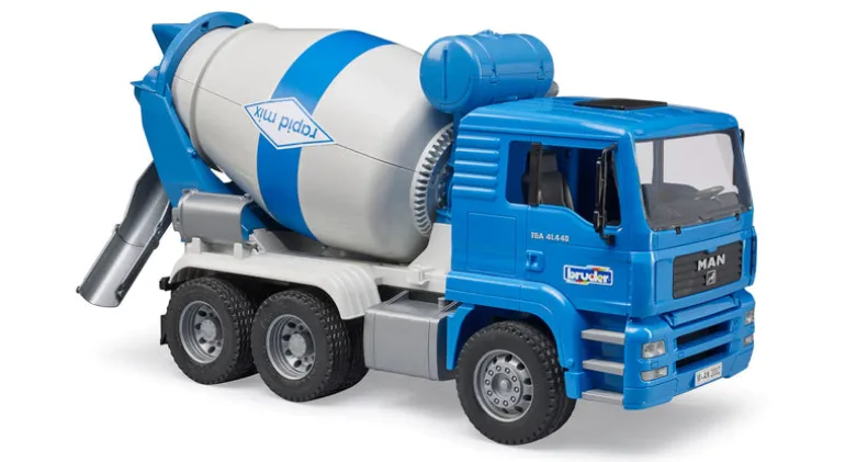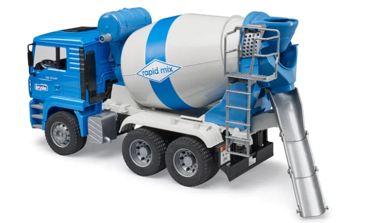This MAN TGS Cement Mixer is the perfect all-round vehicle for construction sites, long-haul deployment, and local distribution. The cab can also be equipped with the optional Light and sound module (item no. 02801 + 02802). Turn the truck mixer drum using the hand crank on the water tank. Just like the real thing, the drum is emptied by reversing its direction of rotation. The spiral on the inside of the drum delivers the load to the discharge chute at the rear. Includes two additional drain chutes!