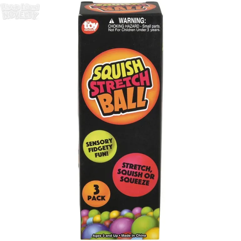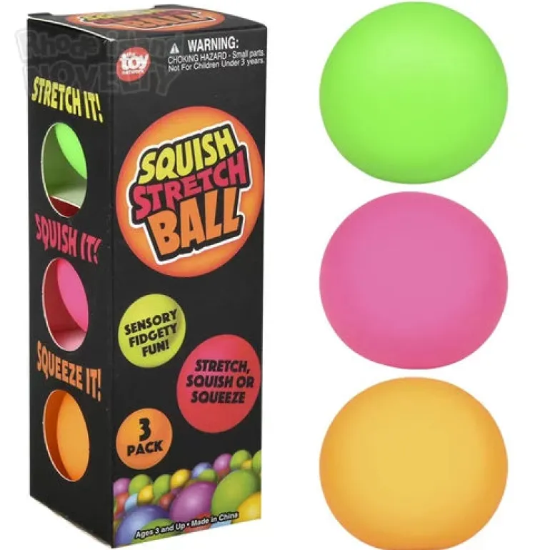 A 3 pack of squishy stretchy gummi balls. Similar in size to a golf ball and packed like a 3 pack of golf balls, these neon colored balls are great for stress relief.