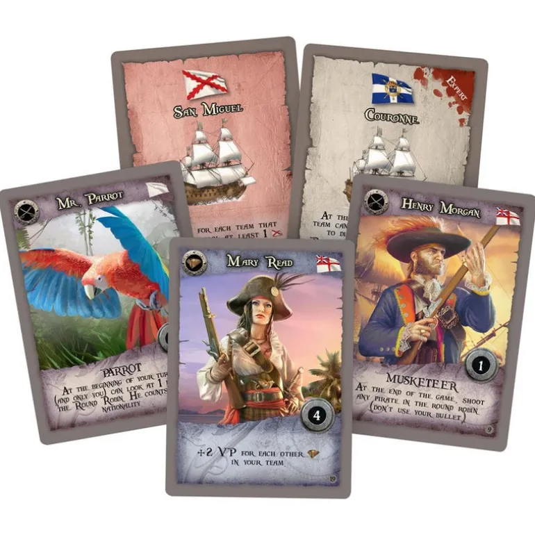 During the game each player will try to corrupt some of the sailors that has not taken yet a side. But each sailor has also a unique ability that who corrupts can use to change the cards on the table…Once all the doubloons will be spent, then some of the pirates could be killed in a gunfight, then the team with more victory points will take control of the vessel… and for the other there will be just the trampoline and the sharks…