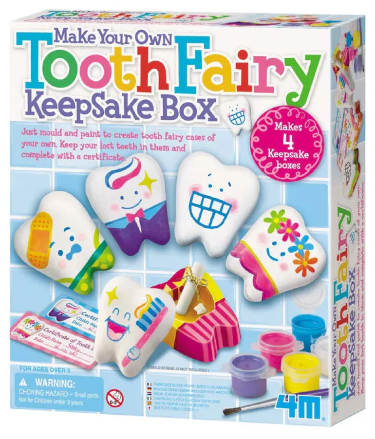 Mold and paint a special place to put your lost tooth. Kit includes two bags of plaster, a tooth fairy blister mold set, five paint pots, one paint brush and detailed instructions.