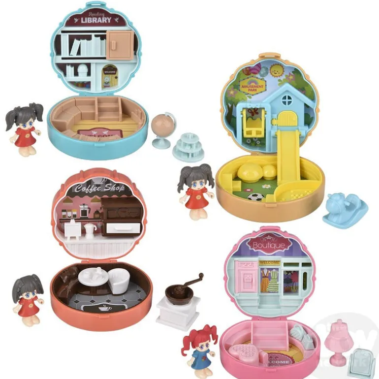 This Micro Playset Blind Bag display features mini playsets with dolls and accessories. Great for interactive play.