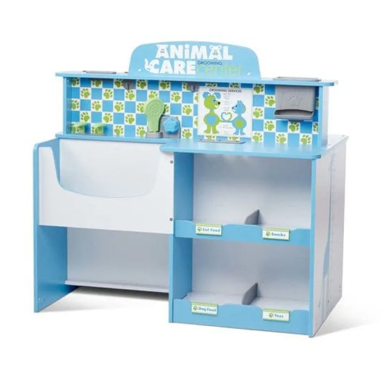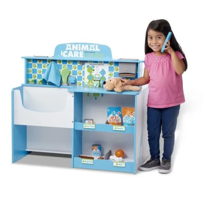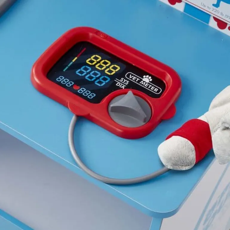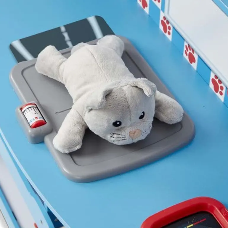 This is the perfect space for caring for furry friends! With a veterinarian side and a groomer side, plush pets can be examined, treated, and pampered for endless hours of imaginative fun. The sturdy wooden play center features an “x-ray” lens with two removable x-rays, pet scale, blood pressure monitor, sink, treat chute, pump bottle dispenser, and lots of storage. There are hooks and holders for lots of accessories. Detailed assembly instructions are included (assembles with just a Phillips head screwdriver, not included). Kids three and older will love having their very own space to nurture and care for their plush pals!