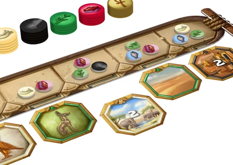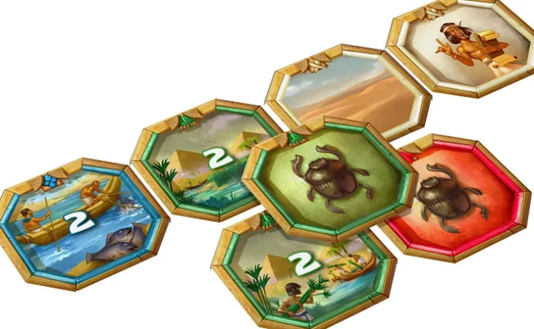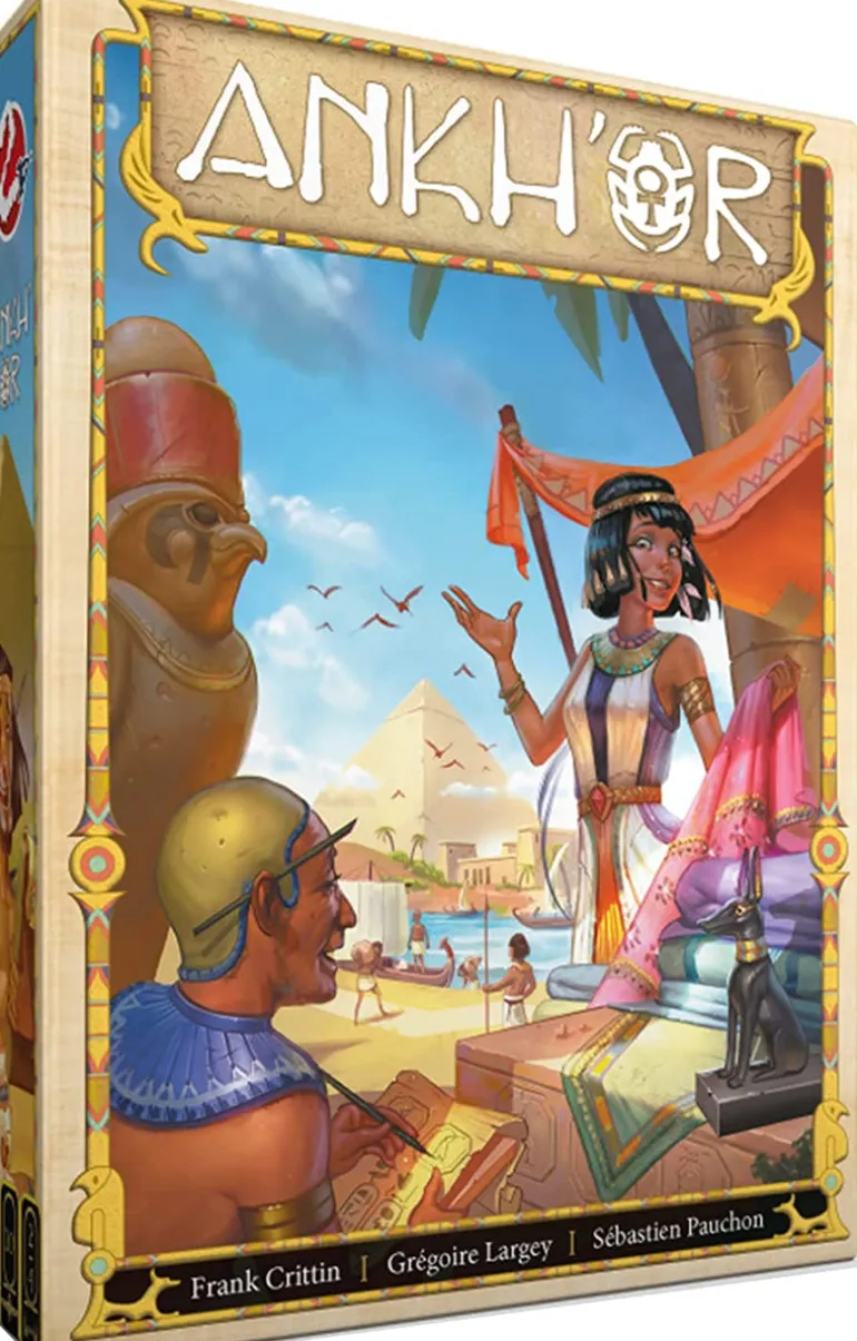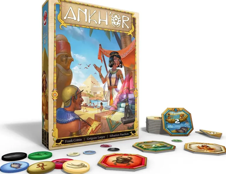 Welcome to Ankh’or, the second game from Space Cowboys 2-Player line. Ankh’or takes place in ancient Egypt where players need to be savvy in the marketplace and a skilled builder if they want to get ahead. Each turn, players either collect resource tokens, like Fish, Cloth, or Bamboo, or they spend those tokens in the market to collect building tiles. Some tiles have special abilities, such as the Warehouse that can store resource tokens or the Scribe that grants players an immediate bonus turn. As tiles are acquired, players must place them in their growing structure. At the end of the game, they score points for grouping tiles of the same symbol and the same color. The player with the most points earns the favor of the gods.