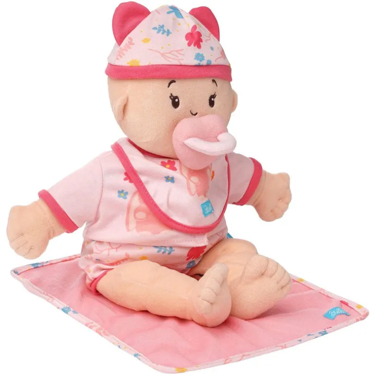 The perfect collection of accessories for bringing home baby. This six piece doll accessory set includes: hat, bib, onesie, cardigan, magnetic pacifier and patterned blanket. Closure on cardigan and bib allows for easy dressing and removal. Doll play encourages motor development and nurturing role-play. Fits Baby Stella 15 inch soft dolls. (Doll sold separately, hat will not fit dolls with pigtails.)