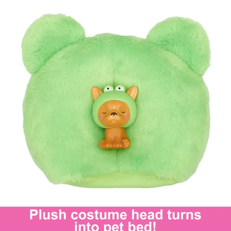 - Kids can dress and style Barbie doll by reversing the costume top to find a super-soft fleece jacket with a trendy print. The costume head turns into a bed for the mini pet friend, too!