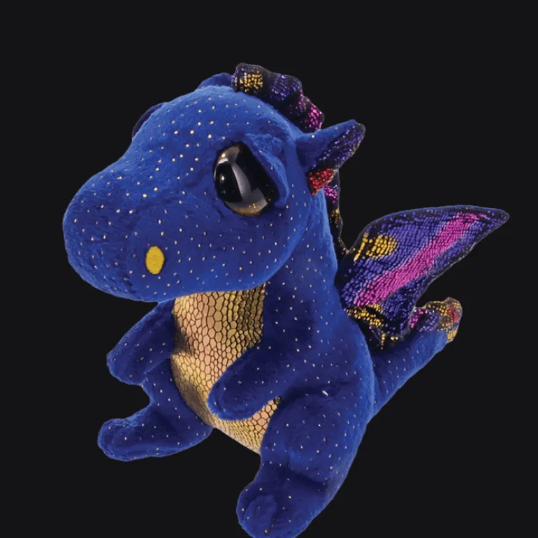 I’m a plush dragon of sapphire blue, with big golden eyes that are looking at you. My name is Saffire I’m speckled with gold. The cutest dragon that you’ll want to hold.