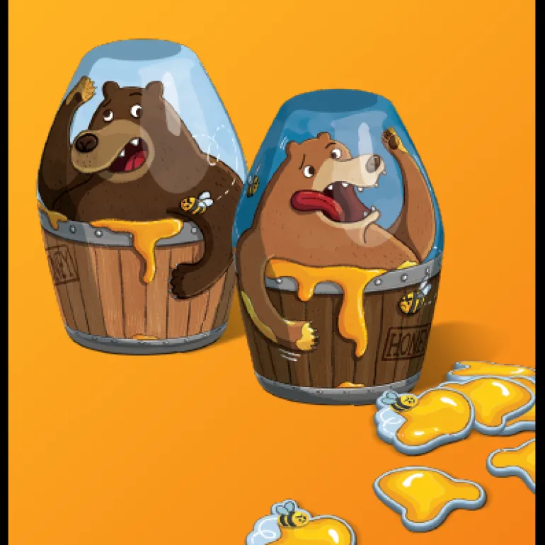 These 2 bears stuck inside their honey barrels love to play by wrestling and tumbling and racing! Roll them over so they can continue chasing one another and their fun never ends! This party game is all about dexterity and fun: with one finger, players rush to flip the bear so that it lands right-side up then pass it quick to their neighbor, to avoid losing a honey token. The goal is to not get caught by the other bear!