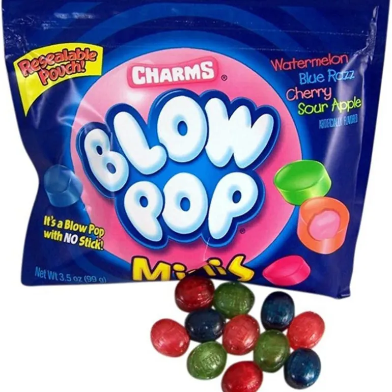Blow Pop Minis offer the same delicious hard candy shell and surprise bubblegum center as Blow Pops without the stick. Resealable pouches lock in the refreshing fruity flavor assortment of watermelon, Blue Razz Berry, sour apple, and cherry.
