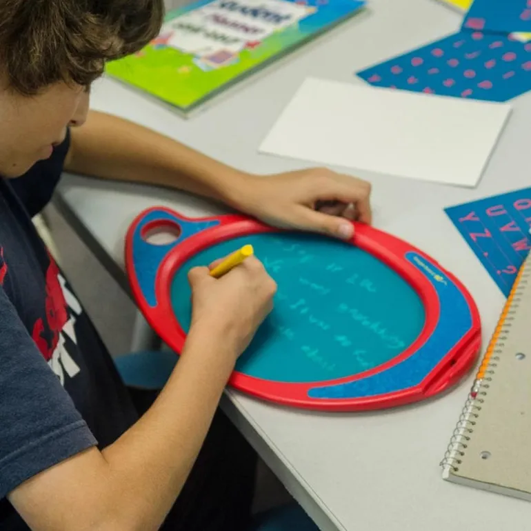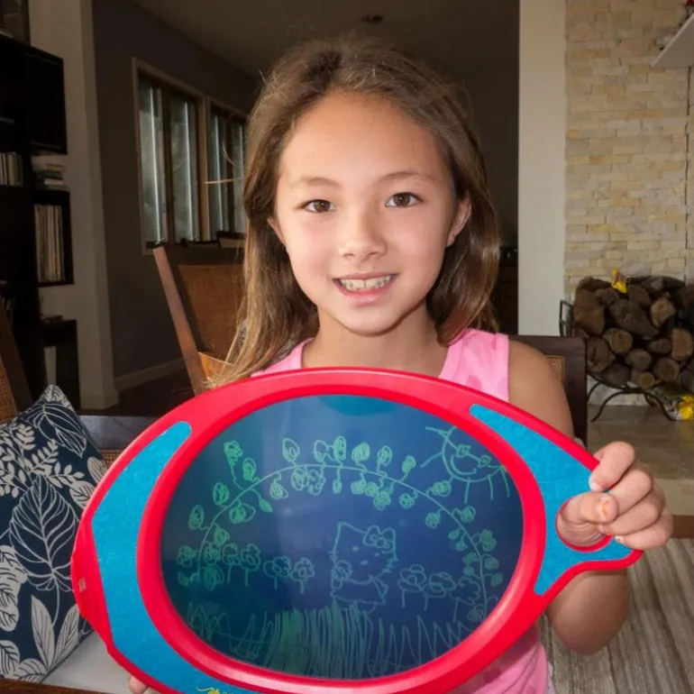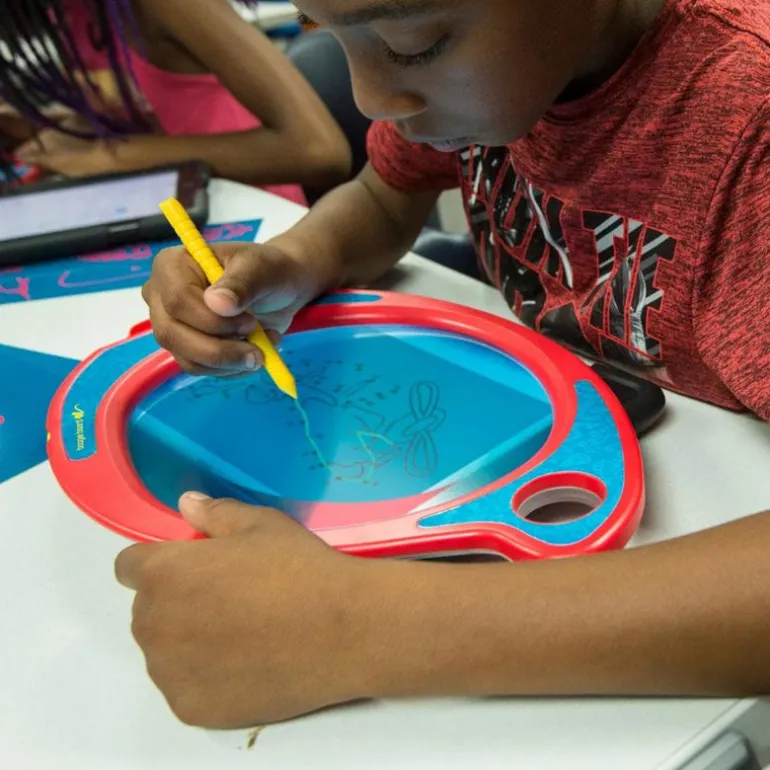This is the first model to feature this advancement in eWriter technology. The translucent writing surface is designed into an artist’s pallet, making it comfortable for hands of all sizes. The durable design allows kids to write, trace and draw anywhere, anything, over and over without the waste of paper. When kids write, they learn.