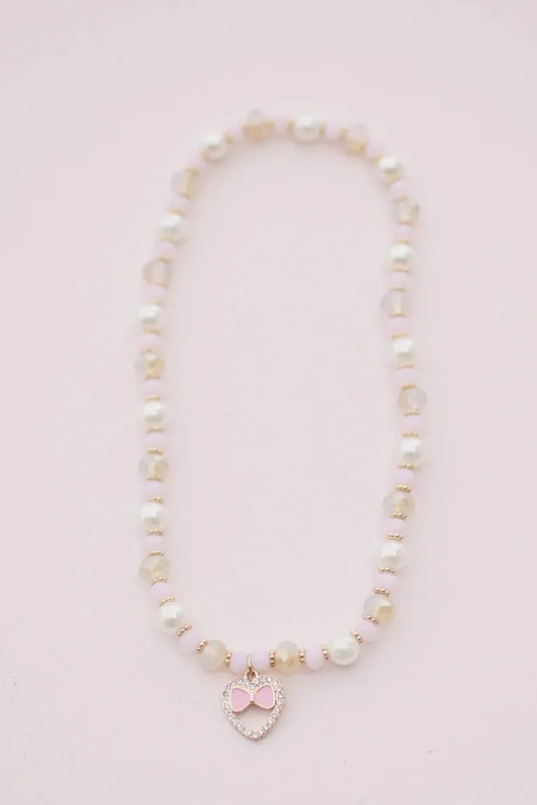 The BoutThe Boutique Love Necklace is one of our most elegant necklaces yet! Strung with pink, white, and gold beads and finalized with a rhinestone incrested heart & bow charm. This necklace is as sweet as can be!