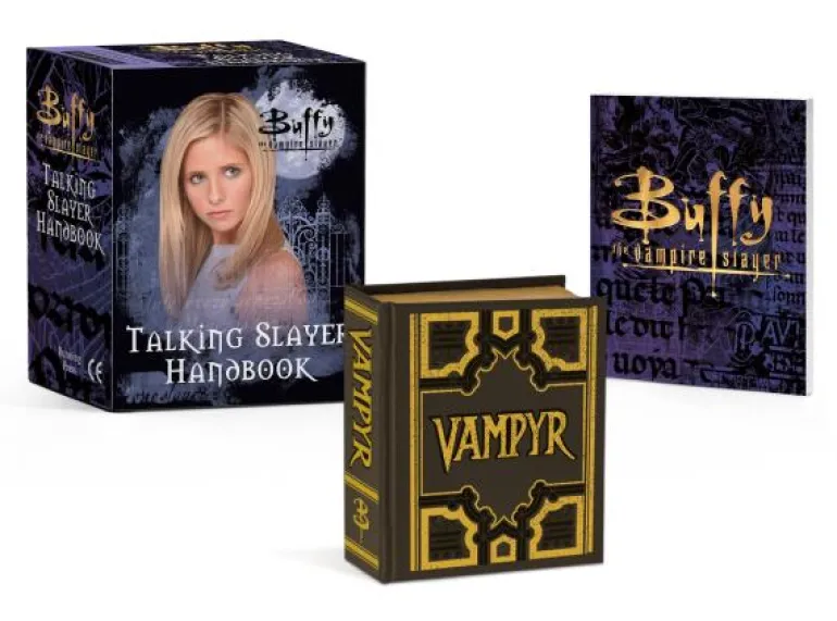 “I’m the thing that monsters have nightmares about.”This one-of-a-kind collectible for fans of Buffy the Vampire Slayer features a molded 2″ x 3″ replica of the Slayer Handbook, Vampyr, that opens to play 10 memorable lines from the show. Featuring quotes from Buffy, Angel, Giles, Willow, and Xander (among them, “That’ll put the marzipan in your pie plate, Bingo” and “Sorry to barge in, I’m afraid we have a slight . . . apocalypse”), it’s the perfect way to commemorate this beloved cast of characters. The kit also comes with a 48-page mini book on Buffy history that features additional quotes and full-color photographs from the show.