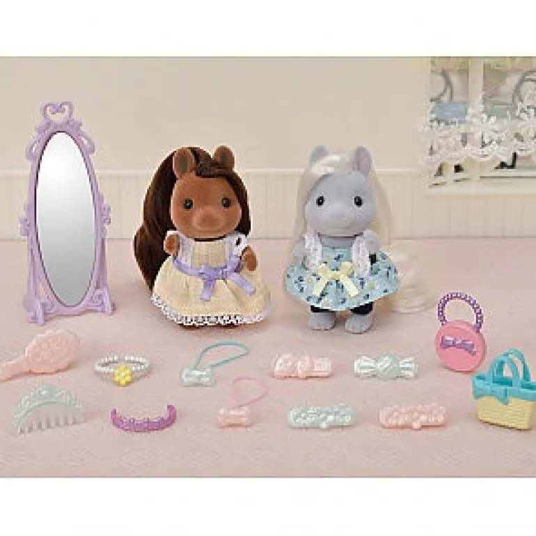 ・The Pretty Ponies set includes two Pony girls with silky hair, a stylish standing mirror, hair accessories, and fashion accessories.