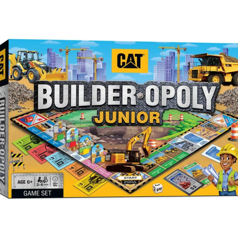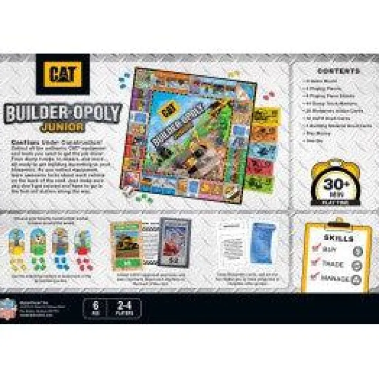 Collect all the authentic CAT equipment and tools you need to get the job done! From dump trucks, to dozers, and more… all ready to get building according to your blueprints. As you collect equipment, learn awesome facts about each vehicle on the back of the card. Just make sure you don’t get injured and have to go to the first aid station along the way. As you collect equipment and vehicles, learn cool trivia about each one on the back of the card. Just make sure you don’t end up needing the first aid kit! Explore the exciting world of construction equipment with CAT Builder Opoly Junior! Includes: Game Board, 4 Punch-Out Playing Pieces with Plastic Stands, 44 Dump Truck Plastic Markers, 28 Blueprints Cards, 18 Caterpillar Deed Cards, 4 Equipment Cards, Custom Money, Custom CAT Die, and Rules For 2-4 players, ages 6+.