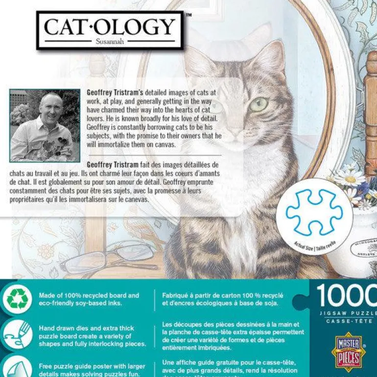 These MasterPieces 25″ x 25″ 1,000pc Cat-ology Puzzles by Jenny Newland featuring Blossom the cat in his natural environment. Through their remarkable eyes, Jenny Newland’s precious puppies and kittens are brought to life with colorful detail and sweet expressions. Jenny is able to capture the personalities of her adorable subjects so well, because she and her family are surrounded at home by four dogs, fifteen cats and various farm animals.