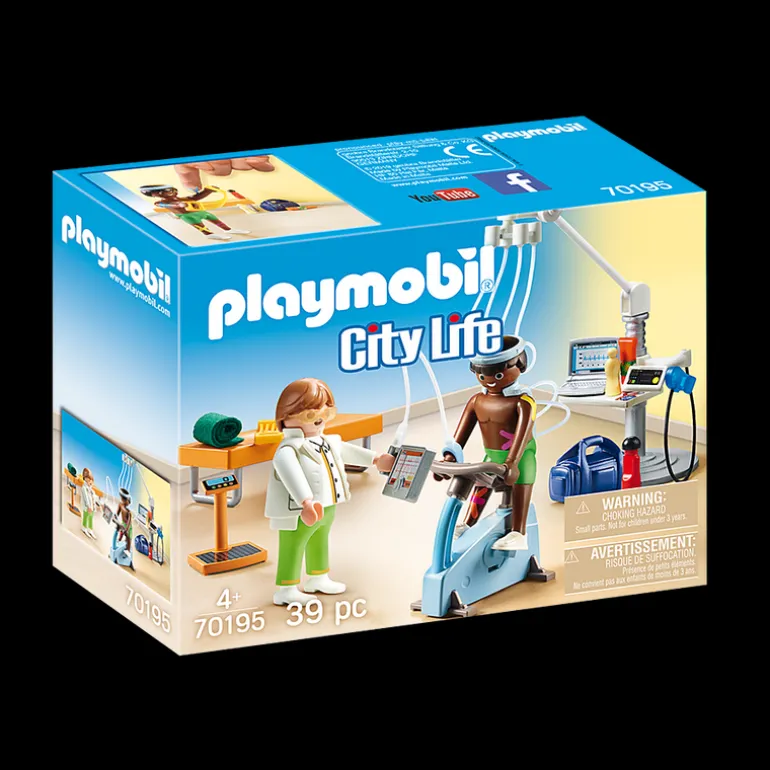 Figures: 1 doctor, 1 man Animals: none Accessories: 1 ECG device, 1 stationary bicycle, 4 tubes, 1 tube with arm cuff, 1 treatment couch, 1 scale, 1 clipboard, 1 back cuff, 1 head cuff, 1 laptop, 1 sports bag, 1 towel, 1 expander, 1 sticker sheet with pysio tapes, 1 tube of ointment, 1 bottle, 1 drinking bottle