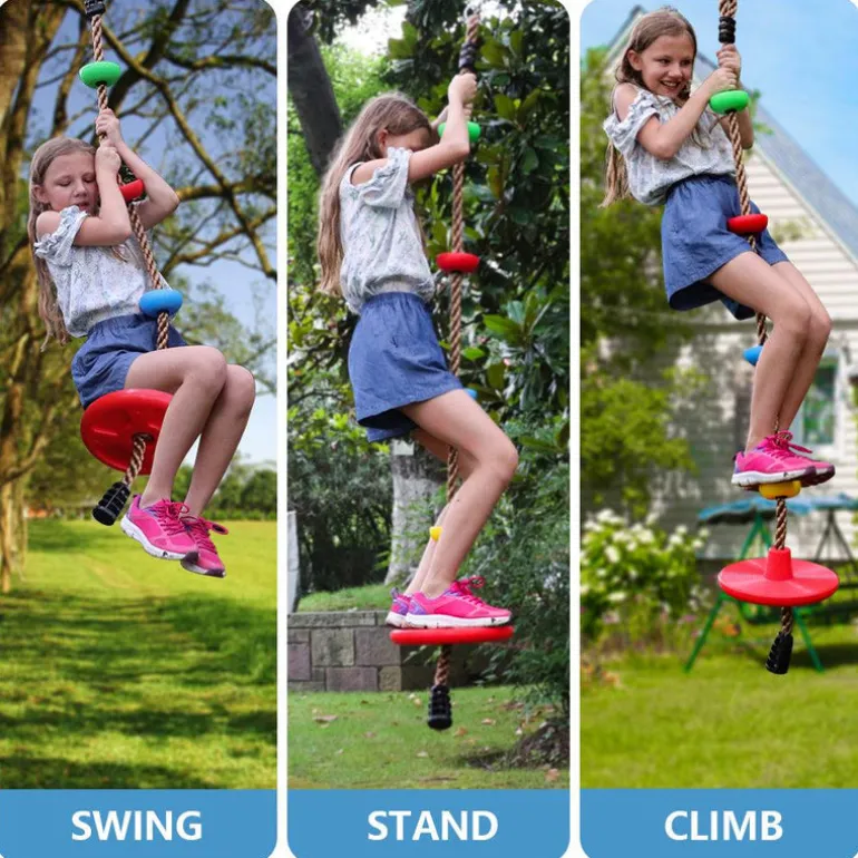 This Climbing Rope with Disc Swing by Great Playthings provides hours of outdoor fun for kids. It’s a great balance builder for teaching children how to balance and build muscle. It’s designed for outdoor play and will last a long time when used properly. We recommend storing indoors when not in use to extend it’s life.
