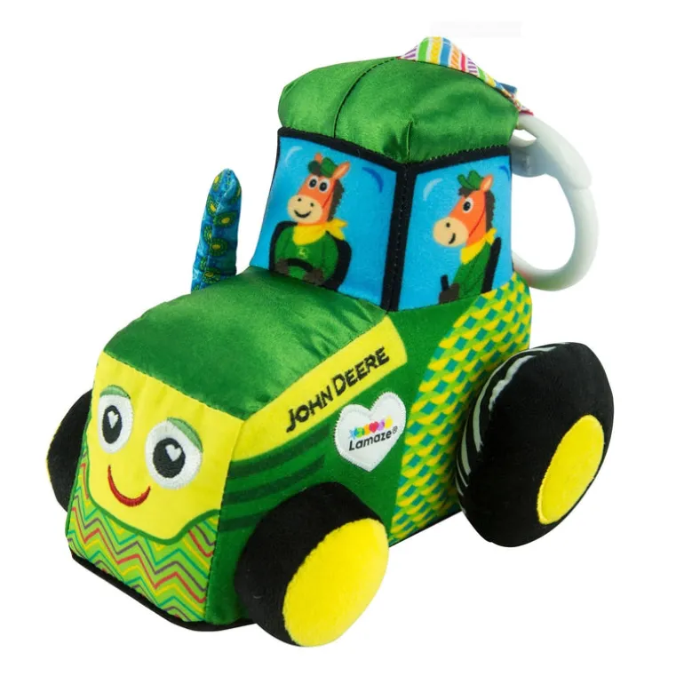 The Lamaze John Deere Tractor Clip & Go toy is full of developmental features to engage your baby. Turning the wheel creates intriguing clicking sounds to encourage auditory development. With interesting textures and crinkling sounds to explore, grabbing and squeezing this toy tractor is even more fun! High contrast patterns and bright colors provide your baby with visual stimulation during play time, and the Lamaze on-the-go clip lets you hook this cute baby toy to strollers, carriers and diaper bags for fun where ever you go.