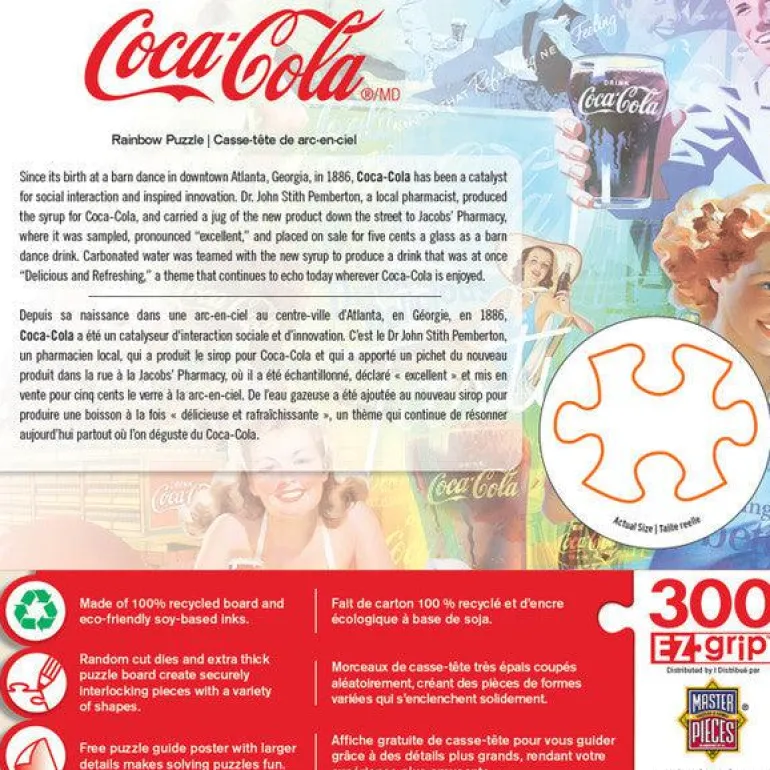 This MasterPieces 18″ x 24″ 300PC EZ Grip Puzzle of Coca-Cola celebrates the history of it’s iconic bottles. Each puzzle has extra large pieces for a fun and quick night of puzzling with the family or group of friends. The EZ-Grip technology used to make this puzzle offers larger puzzle pieces that snap together perfectly, without compromising image quality. To reduce its impact on our environment, the chipboard used in this puzzle is made of recycled material.