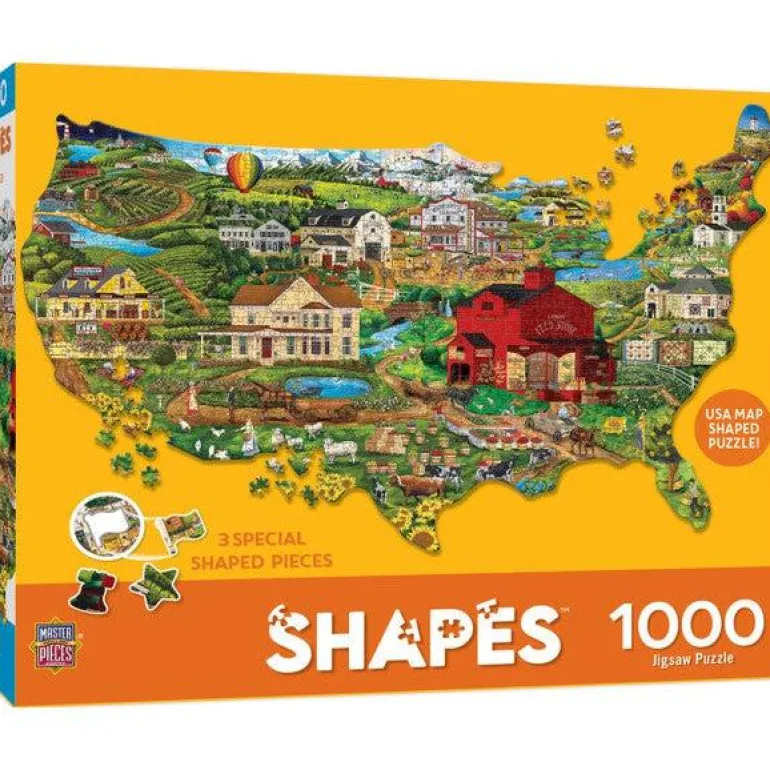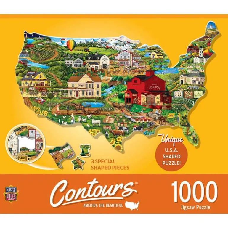 This 1000pc USA Map shaped puzzle is by folk artist Art Poulin. USA Map shaped with detailed folk art of the diverse American landscapes throughout the country. Includes three special shaped pieces hand-drawn into the dieline.