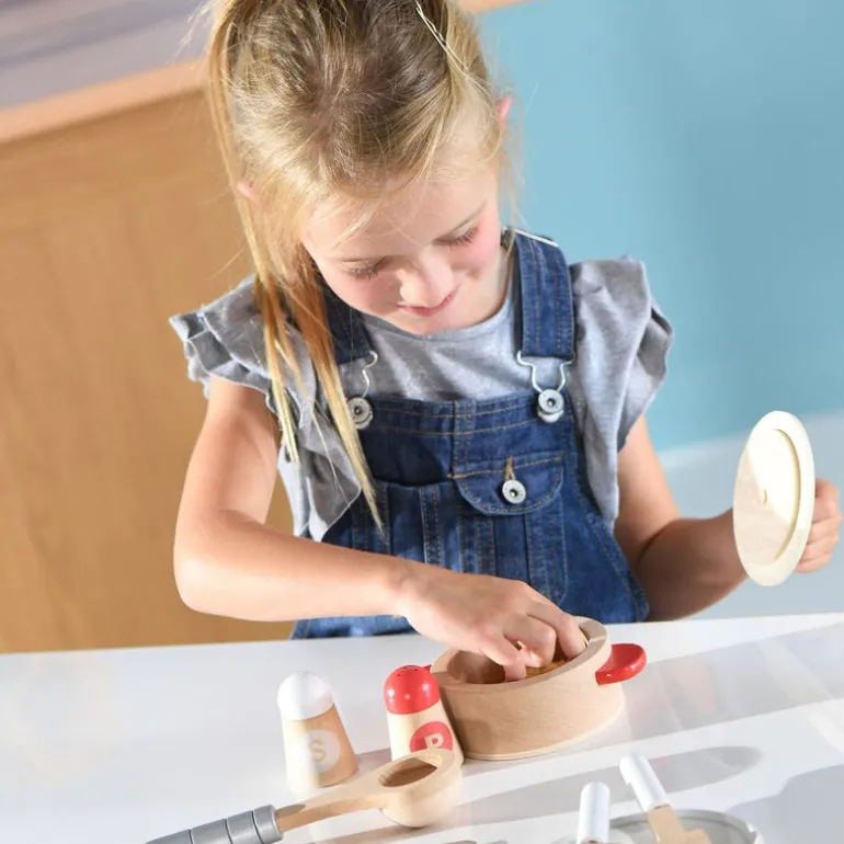 With the Cook & Serve Set’s wooden pot, pan, plates and accessories, your child has everything they need to cook a delicious meal for friends or family!