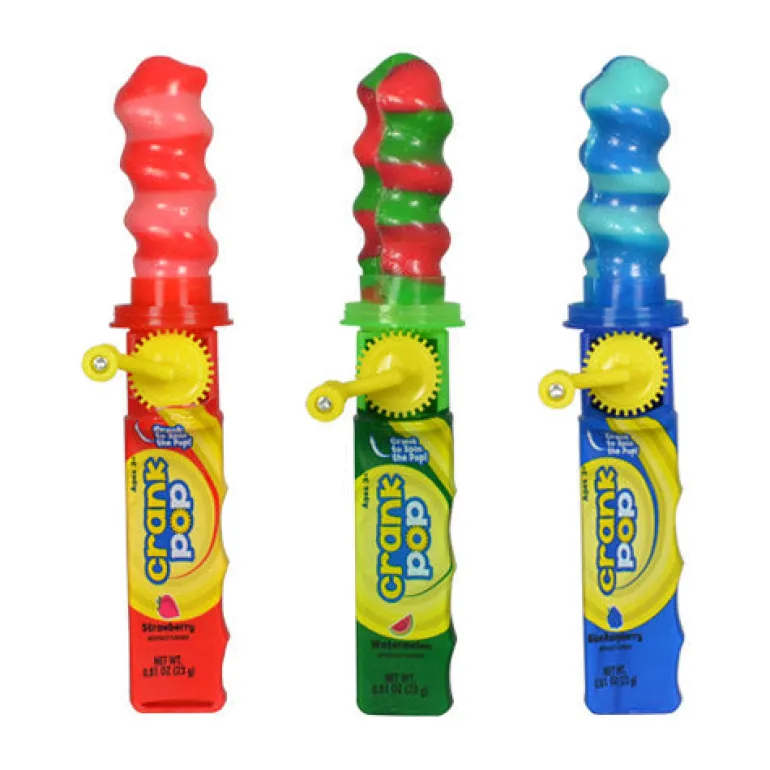 Turn the crank handle to send this spiral lollipop spinning. Each pop is whirling with flavor: Strawberry, Blue Raspberry, Cotton Candy & Watermelon.