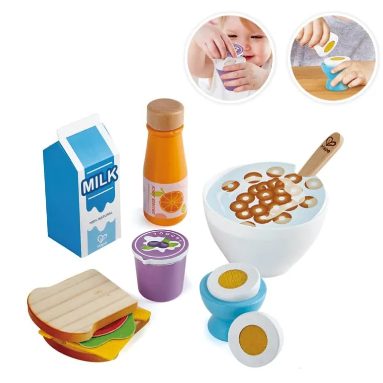 Get ready for the most important meal of the day with this fun breakfast set. Includes yoghurt with opening lid, milk and a bottle of orange juice which clicks when you turn the cap. Also includes one egg with eggcup, a bowl of oatmeal with a spoon, two slices of toast and one slice each of tomato, lettuce and cheese.
