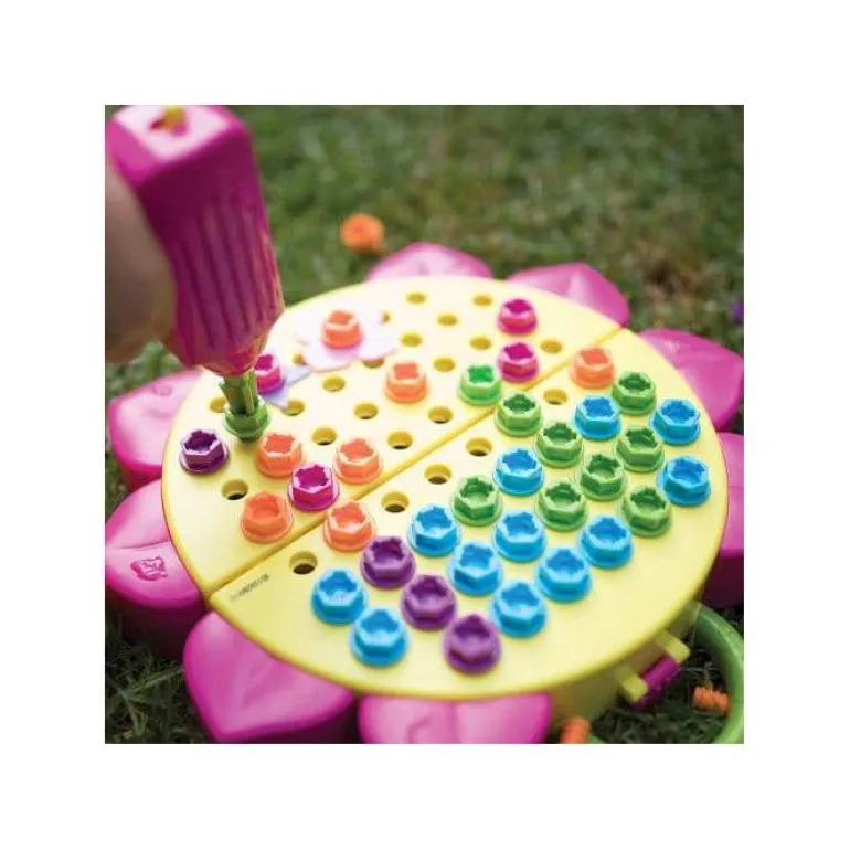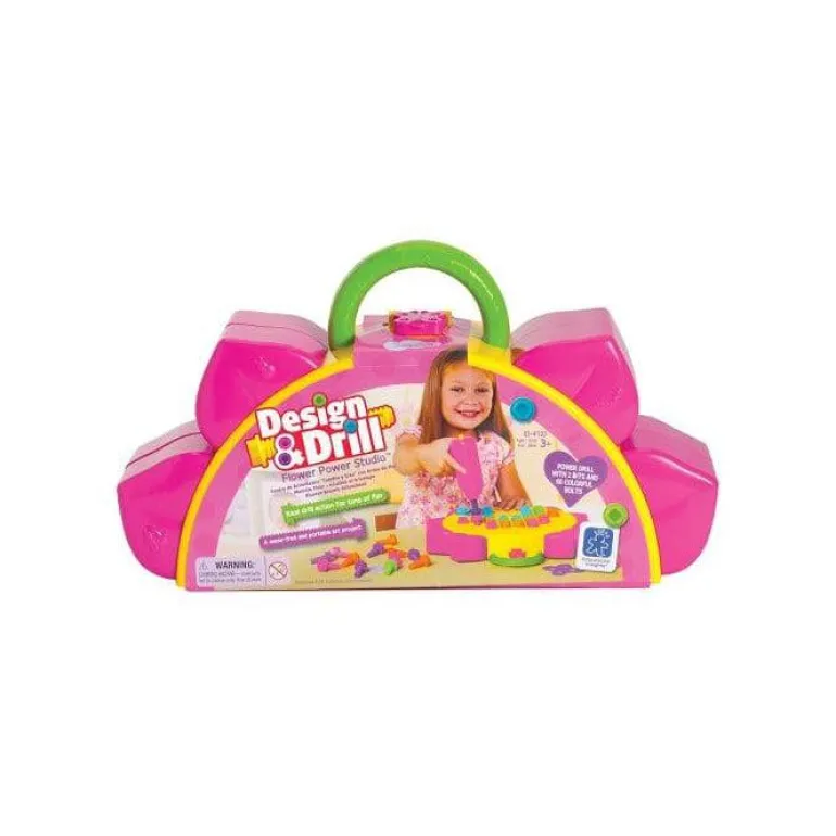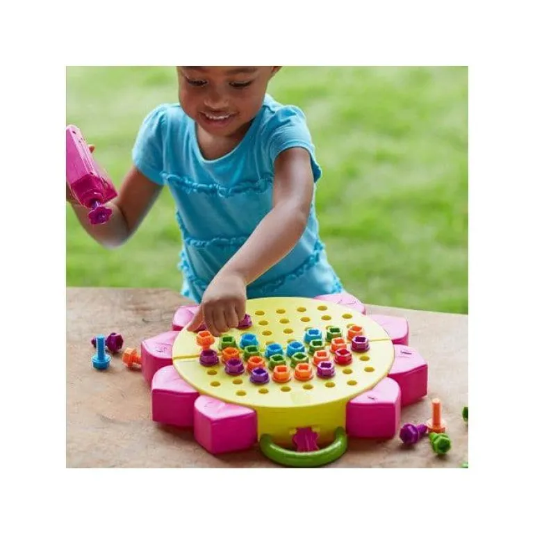 Brilliance blossoms with this cute and colorful design studio! Girls love the action and sound of the kid-friendly power drill as they arrange and drill the designer plates and bolts into gorgeous, garden-worthy patterns and designs. When it’s time to pack up the fun, everything fits neatly into the fold-up board for no-mess creativity – and learning – on the go!