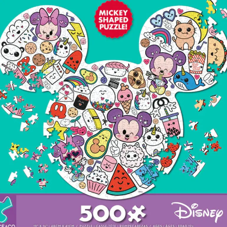 This 500 piece puzzle in the shape of Mickey Mouse’s face contains Mickey and Minnie, cute animals, and lots of happy snacks