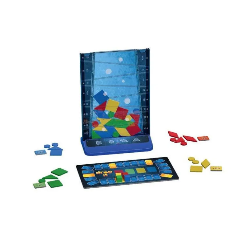 This colorful, inventive family game is easy to learn but deceptively mind-boggling! One at a time, each player drops a shape into the vertical game boards drop zone. Players earn points for the highest level that their shape reaches when it lands and extra points for touching bonus circles. But be careful: Dont break a landing rule! The shape you dropped is not allowed to touch matching shapes or colors after it lands. If you break a landing rule, you will go away empty-handed. The winner is the player or team with the most points at the end.