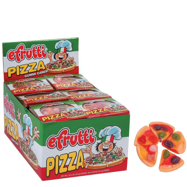 Individually wrapped in fun, miniature pizza boxes, this pizza candy offers a smooth gummy texture in an array of fruity flavors.