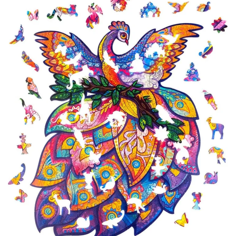 The Fairy Bird puzzle from Unidragon is a scattering of figures: birds and flowers, peacocks and other animals. When joined together, they form a marvelous garden with the Fairy Bird – the Peacock – at its head. Even if its song is not the sweetest, the beauty of his feathers is unparalleled.