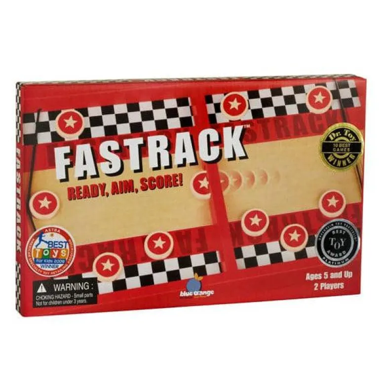 Fastrack is a disc-shooting speed game filled with non-stop thrills and sporty action. Using only one hand and the elastic band, the goal is to fire all 10 discs through the tiny slot to the other side of the track. Aim carefully but be fast or you’ll be bombarded by your opponent’s zooming discs. Ride the fine line between fast speed and accuracy to win! This all wooden dexterity game is sustainably made.