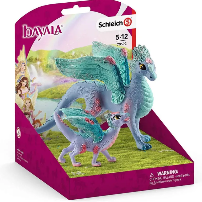 The beautiful flower dragon mum and her sweet baby by Schleich® bayala® live in the wide meadows of the dazzling bayala world. The baby dragon found the flower unicorn foal as a friend to play with and the two love to frolic over the flower fields.