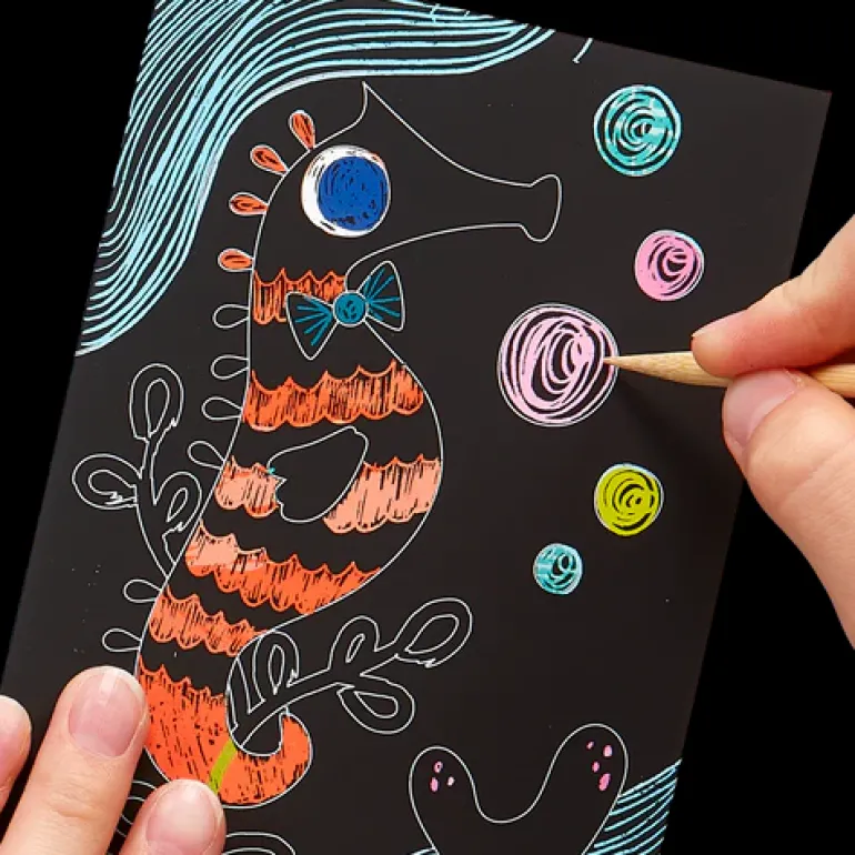 - Travel sized scratch art kit with friendly fish