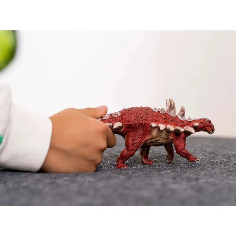 Who would have guessed, the Gastonia is a herbivore and wouldn’t hurt a fly, even though it looks fearsome with the large spines on its back and long tail. This dinosaur, which belongs to the avian dinosaur family (that means bird-like), only pretends to be dangerous. Instead of getting into trouble, it prefers to wander through the countryside on its sturdy legs. It’s probably out looking for a lush meadow.
