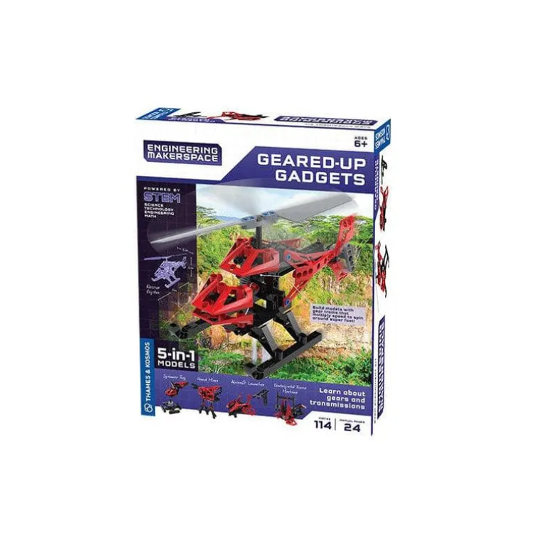 Build five fun gadgets and learn about gears and transmissions. Create a helicopter model with a rotor that spins using a rubber band-powered motor. Assemble a spinner toy that you wind up to launch a fast-spinning top. Make a centripetal force machine that flings its arms outward at high speeds. Build a hand-mixer that demonstrates a gear train. Construct a cool aircraft launcher that flings a model vehicle across the room on a zipline. A 28-page manual guides your model building and experiments with step-by-step illustrated instructions.