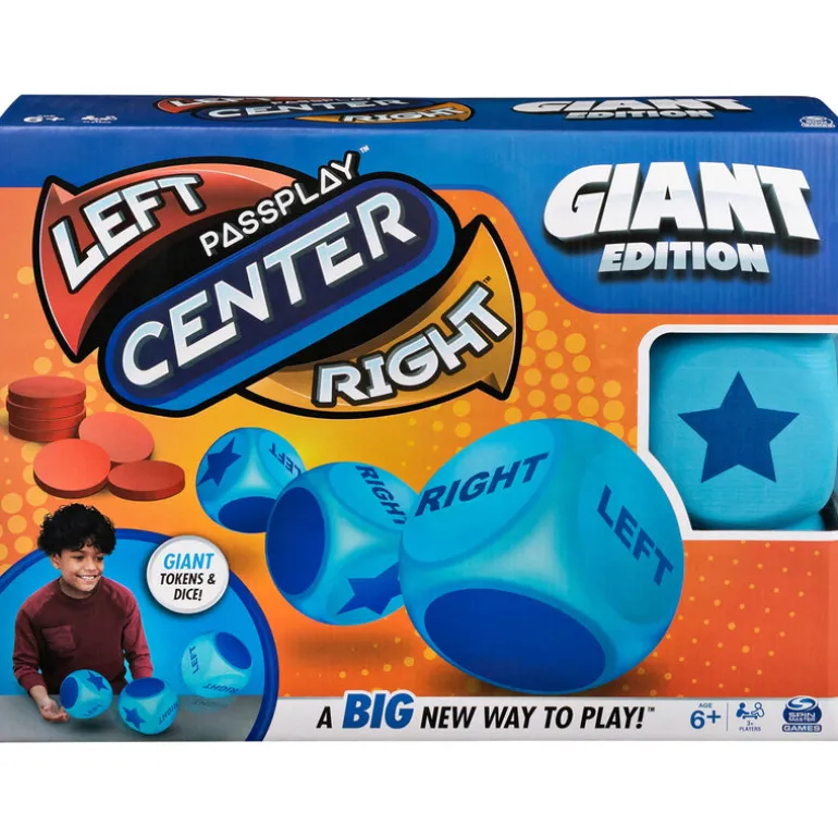 THE GAME OF LEFT CENTER RIGHT is the addictive family dice game that’s fast-paced, fun-to-play, and now GIANT! Three oversized dice and 24 large tokens bring a new dimension to the classic roll-and-pass game play. Starting with 3 tokens, each player takes turns rolling all 3 giant dice and then does what the dice say. Roll Left, Center, or Right, and pass a token in that direction. Roll a Dot, and you can keep what you’ve got – 3 Dots is the perfect roll. Out of tokens? You’re not out of the game – the player to your left or right might pass you a token. When one player has all the tokens, they win big! Take your game off the table and turn it into a roomful of fun. Exciting and suspenseful with every roll, Giant Size THE GAME OF LEFT CENTER RIGHT is for 3 or more players, ages 6+.