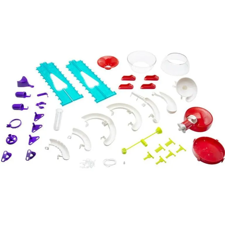 Build your own gumball machines and learn physics lessons in the process. A turn of a handle dispenses one gumball at a time out of the clear storage globe and down the track. Each segment of the track teaches a different lesson in physics: force, motion, momentum, gravity, energy, and more. The segments can be moved around to create an almost limitless number of different machines.