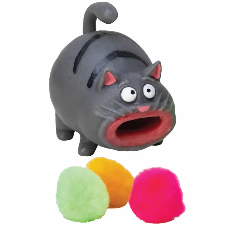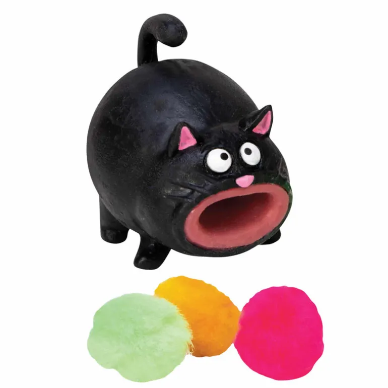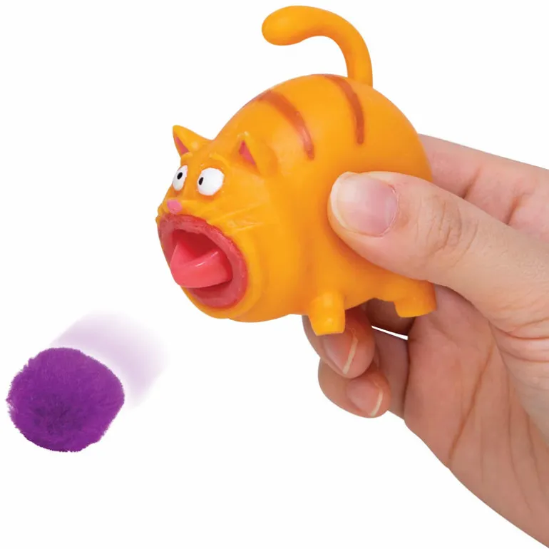 This Kitty has a hairball! Load your new feline friend with a soft pom pom hairball, then give them a squeeze and HACK! Their hairball shoots across the room, or at a funny friend. Perfect for endless amusement, and a great addition to any gift!