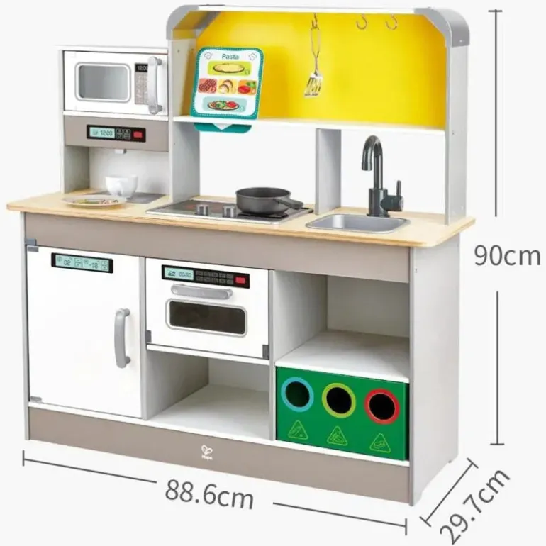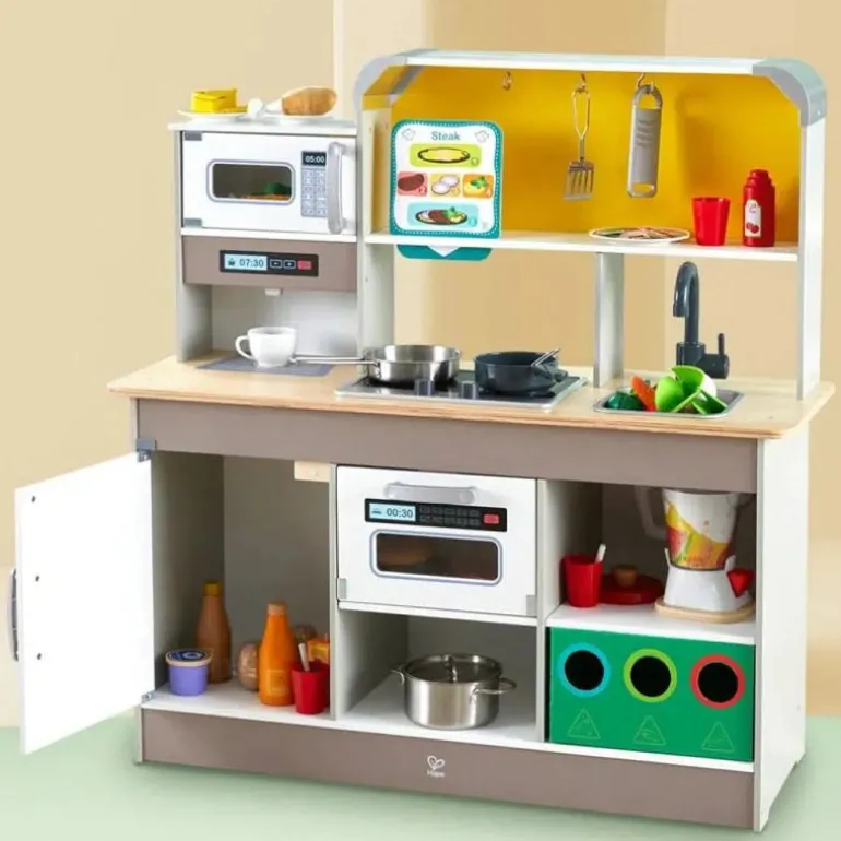 - This delightful playset will help kids become familiar with using kitchen appliances, recycling, and cooking. This type of pretend play lets kids learn about working in and organizing a kitchen