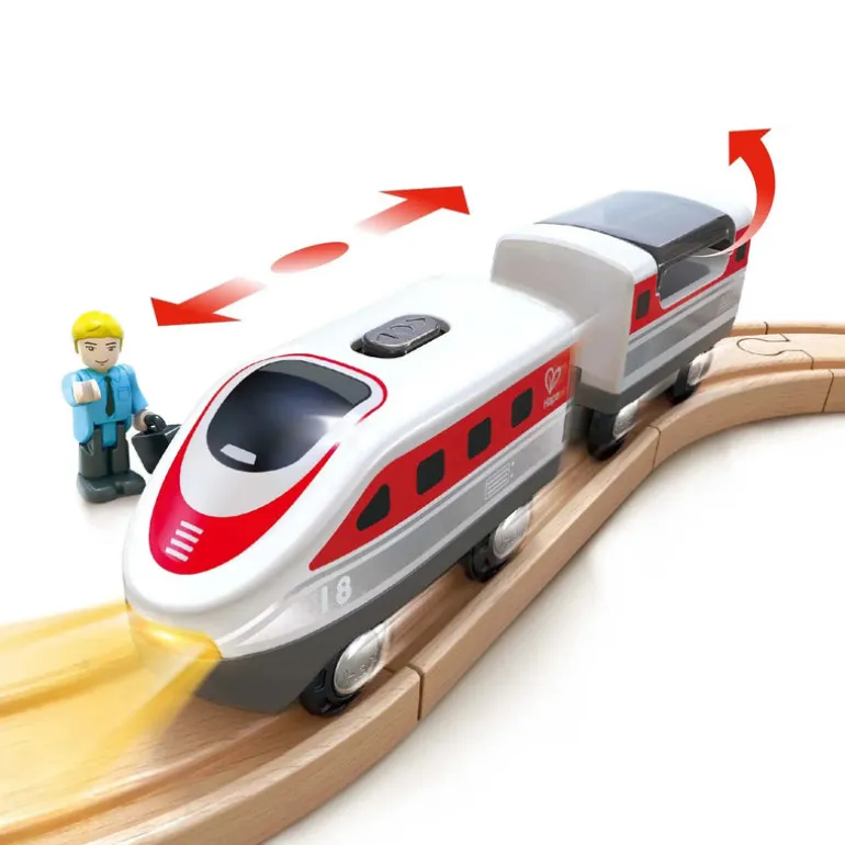 All aboard! With this colorful wooden train set, your little one will role-play as a conductor, an engineer, or a passenger for hours. The battery-powered locomotive has a working headlight and goes forward and backward – but that’s just part of the urban fun. The train station, shops, construction site, airport and openable plane provide endless creativity and storytelling.