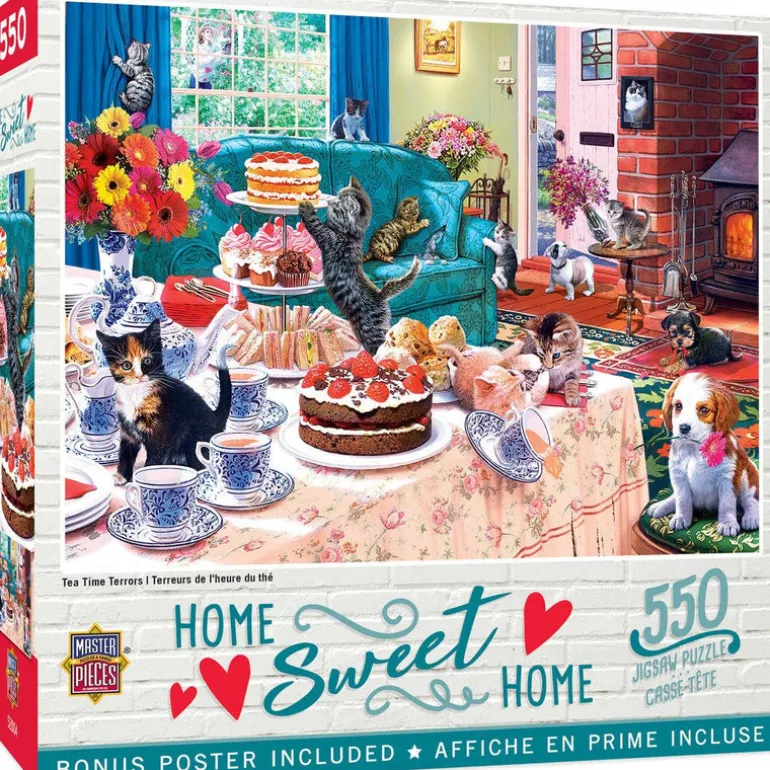 These MasterPieces 24″ x 18″ 550PC Home Sweet Home puzzles. The kittens have taken over tea time. To reduce their impact on our environment, the chipboard used in these puzzles is made of recycled material.