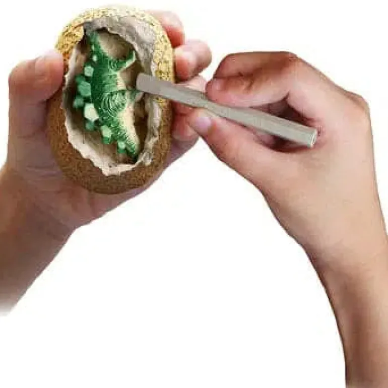 Each egg contains one plastic dinosaur model. The eggs are blind-packed, so it’s a surprise which of the 12 dinosaur figures you will get. A small chisel tool for digging the dino out of the egg and an instruction manual are included.