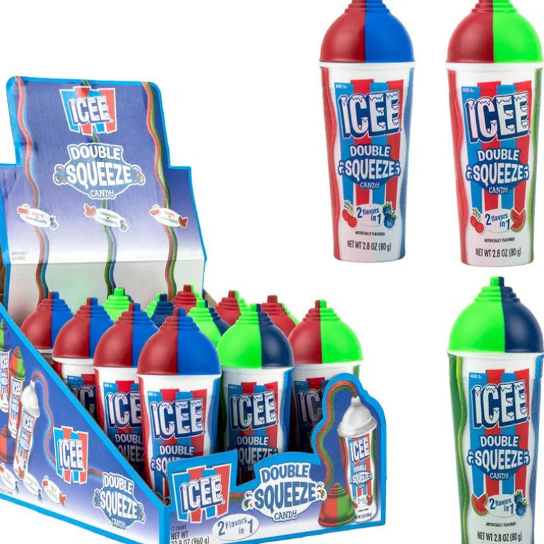 Double the squeeze, double the fun. The mixed ICEE® candy contains two flavors, which are dispensed at the same time by squeezing the cup. Flavors include: cherry & blue raspberry, cherry & watermelon, or blue raspberry & watermelon.