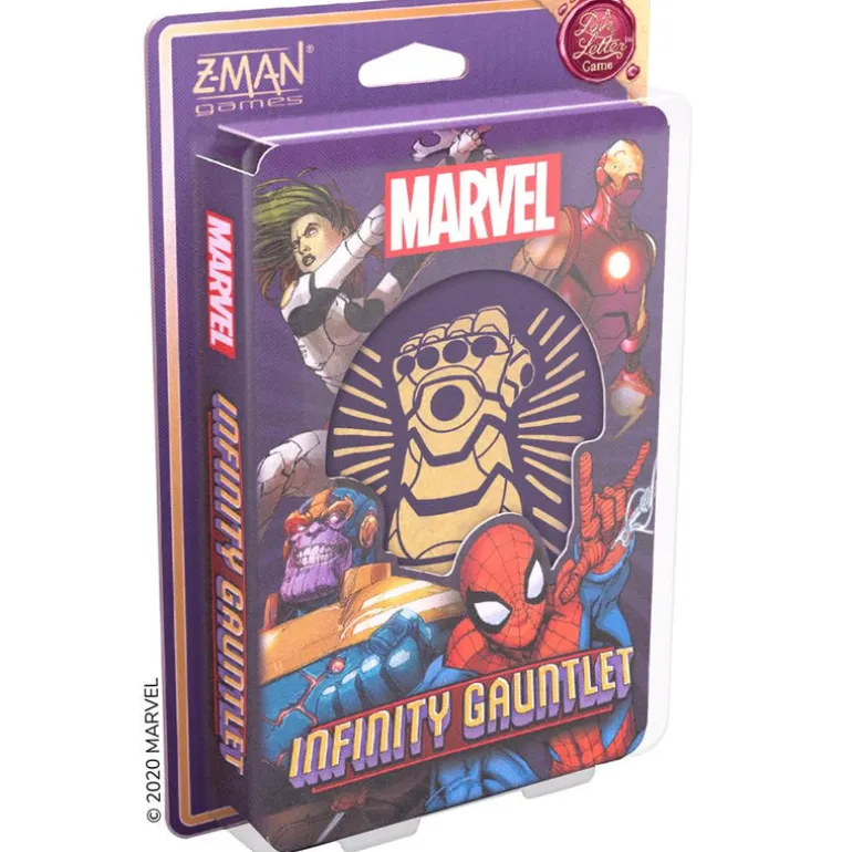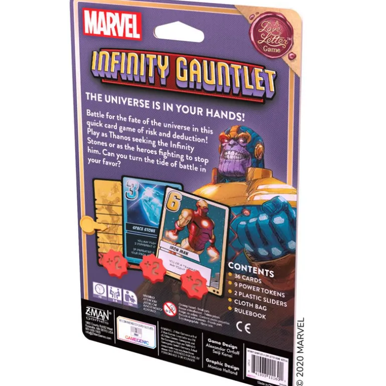 Based on the beloved game Love Letter and set in the Marvel Universe, this is a quick card game of risk and deduction for 2–6 players. One player is the Mad Titan himself, trying to gather the Infinity Stones to bend the universe to his will, while 1–5 other players assemble heroes to stop Thanos before he achieves ultimate power!