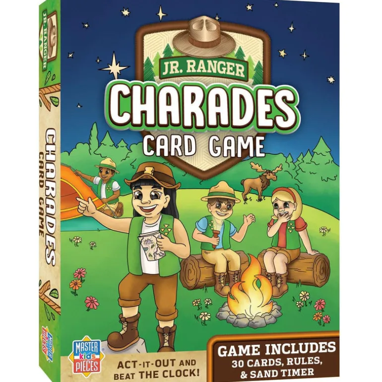 Enjoy family game night with this Jr. Ranger Charades Game by MasterPieces. This game includes 29 charades cards with park activities, animals, and campsite fun. Act out the words or phrases on the cards. Collect the most cards to win the game! For 2+ players, ages 4+.