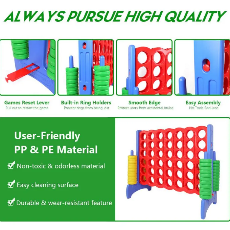 Our product made of carefully selected materials, the Giant Four in a Row Connect Game set is very durable and safe. The pieces are large and easy to handle. Premium PE and PP materials can provide you with a quality product that will last. The edges are very smooth to ensure players will not be scratched while playing and can have lots of fun.