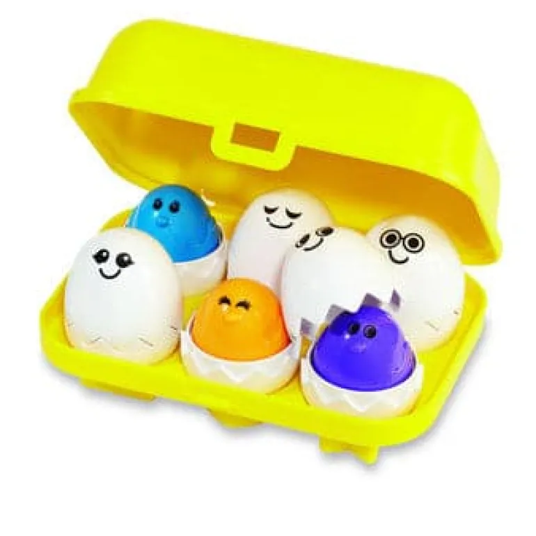 Little ones will have a ball with this toy! Lift off the eggshell to reveal a cute, colorful chick inside and press down on the chick to hear him squeak! The bottom of each egg contains a unique shape, sort the shapes to find the egg’s home in the carton. For ages 12m and up.
