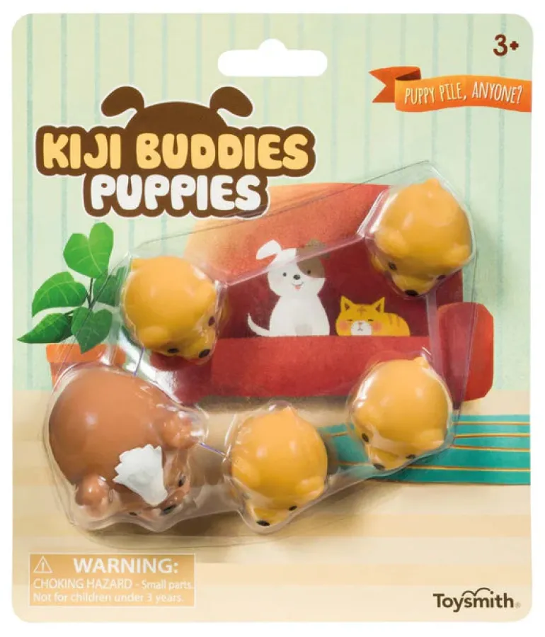 This family of Kiji Buddies Puppies squish toys is a perennial best-seller. Each living room-themed blister packet contains 5 tiny dog squish toys: 1 dad and 4 puppies. Daddy dog measures 1.75 inches and is a solid brown color with a white spot on his head and black eyes and nose.