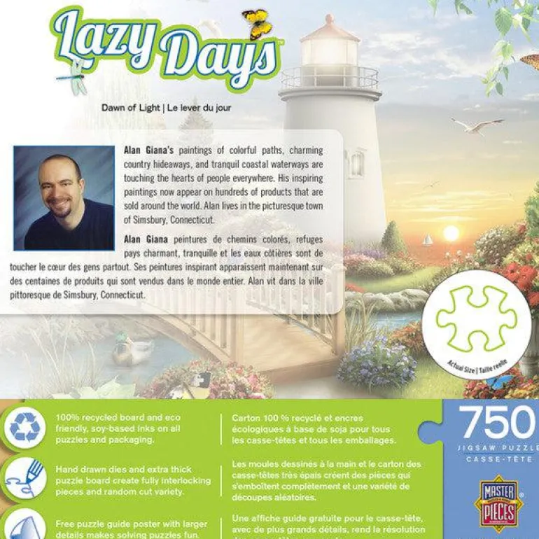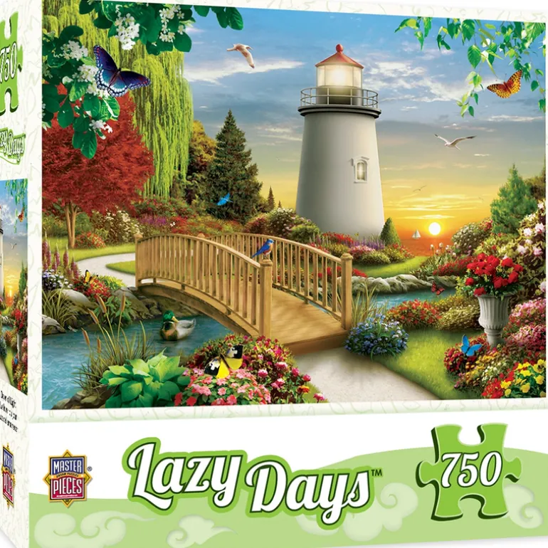His inspiring paintings now appear on hundreds of products sold all around the world. Alan lives with his loving wife, Pamela, in the picturesque town of Simsbury, Connecticut. Lazy Days puzzles are full of breathtaking scenery and effortless beauty. This image features a bridged pathway to the lighthouse. The day is ending with a beautiful sunset in the distance.